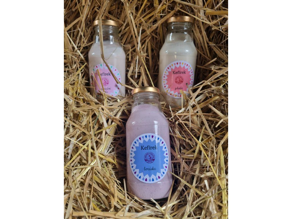 KEFÍREK – BORŮVKA. OCHUCENÉ KEFÍROVÉ MLÉKO. KYSANÝ MLÉČNÝ VÝROBEK. Hmotnost: 300 g. Složení: kravské mléko, borůvkový sirup (borůvky, třtinový cukr, kyselina citrónová), kefírové kultury. Obsah tuku: min. 4,2 %. Skladujte při teplotě 2-8°C.