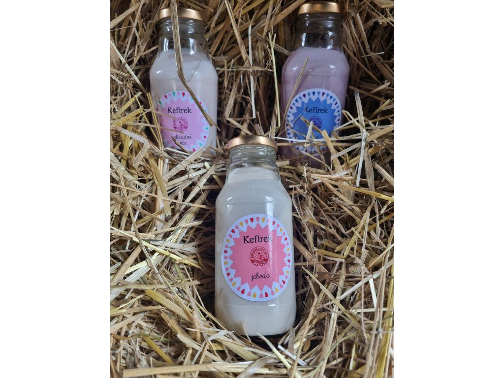 KEFÍREK – JAHODA. OCHUCENÉ KEFÍROVÉ MLÉKO. KYSANÝ MLÉČNÝ VÝROBEK. Hmotnost: 300 g. Složení: kravské mléko, jahodový sirup (jahody, třtinový cukr, kyselina citrónová), kefírové kultury. Obsah tuku: min. 4,2 %. Skladujte při teplotě 2-8°C.