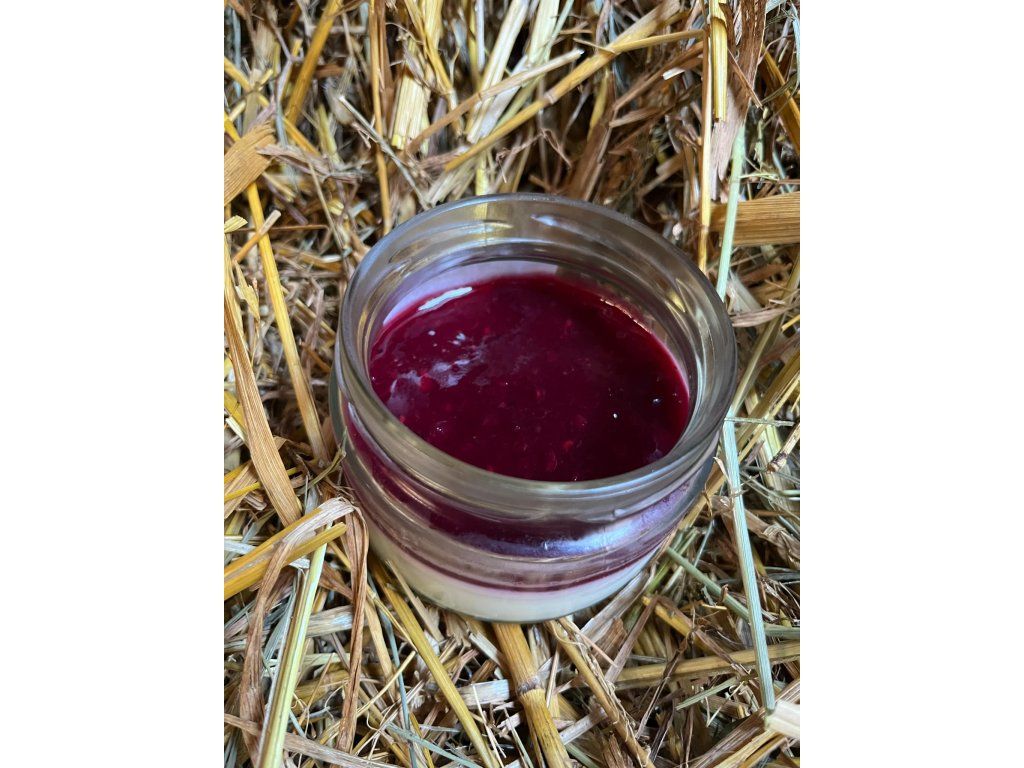 KRAVA COTTA. MLÉČNÝ DEZERT S OVOCNÝM PŘELIVEM. Hmotnost: 150 g. Složení: kravské mléko, sirup zahradní směs (jahody, červený a černý rybíz, maliny, angrešt, ostružiny, třtinový cukr, kyselina citrónová), cukr, jedlá želatina. Skladujte při teplotě 2-8°C.