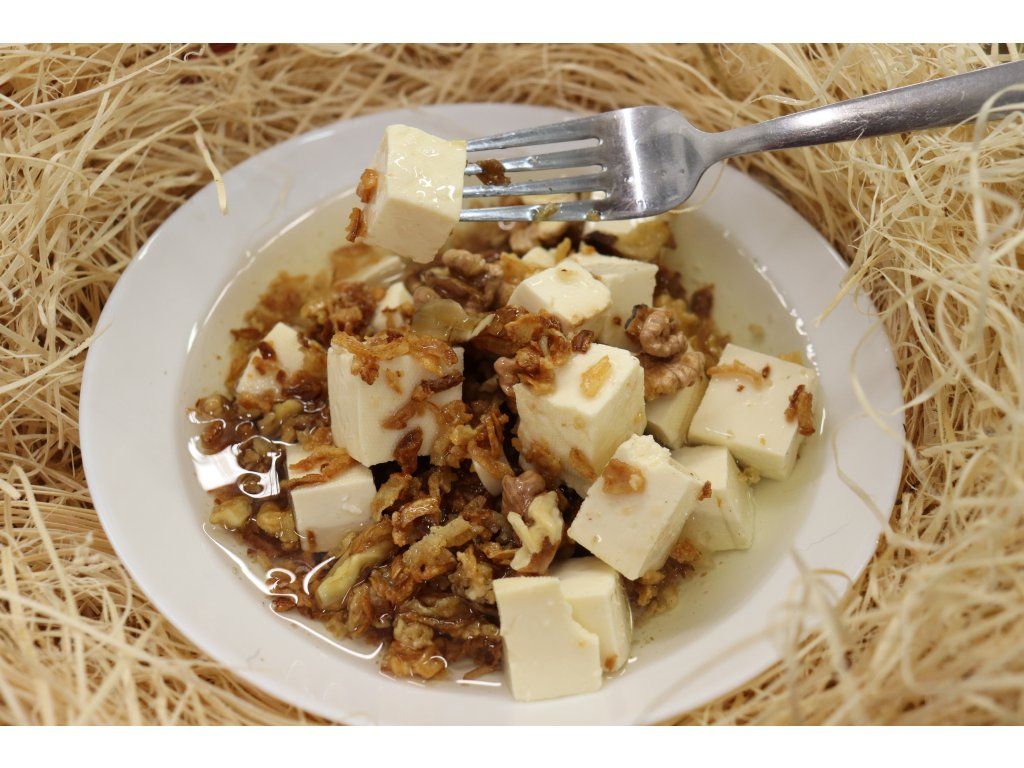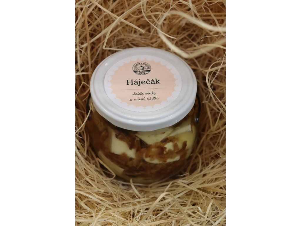 ČERSTVÝ SÝR VE SLUNEČNICOVÉM OLEJI S VLAŠSKÝMI OŘECHY A SUŠENOU CIBULÍ. Hmotnost pevné složky: min 250 g. Složení: čerstvý sýr ( kravské mléko, mlékárenské kultury, jedlá sůl), vlašské ořechy, slunečnicový olej, sušená cibule. Tuk v sušině min. 40 %, sušina min. 50 %. Skladujte při teplotě 2-8°C.