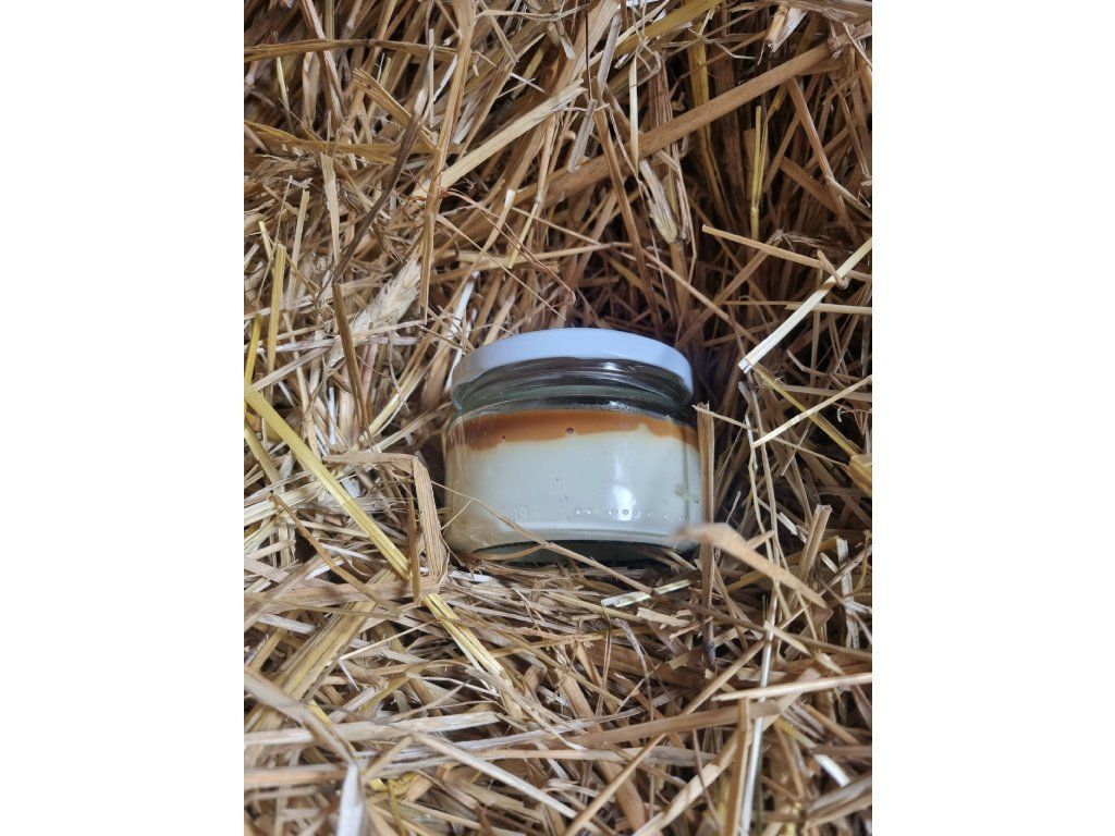 TVAROHOVÝ MLS S KARAMELOVOU POLEVOU – TVAROHOVÝ DEZERT S POLEVOU. Hmotnost: 150 g. Složení: tvaroh měkký (kravské mléko, syřidlo), karamelová poleva (cukr, smetana, máslo). Tuk v sušině min. 35 %, sušina min. 25 %. Skladujte při teplotě 2-8°C. Výrobce: Lenka Jelínková, Háje 3, 26301 Hřiměždice